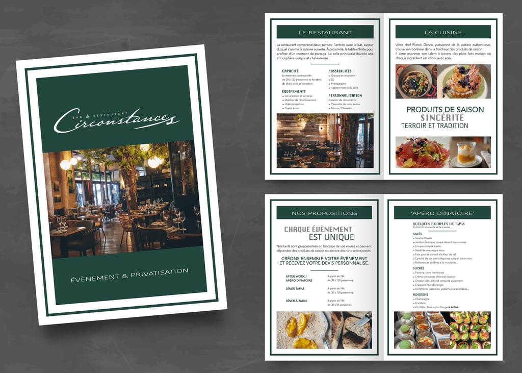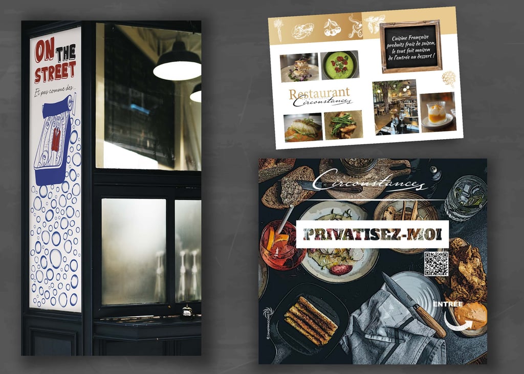 Egalement création de menus, stickers pour la façade, prospectus, invitations et autre identité visuelle